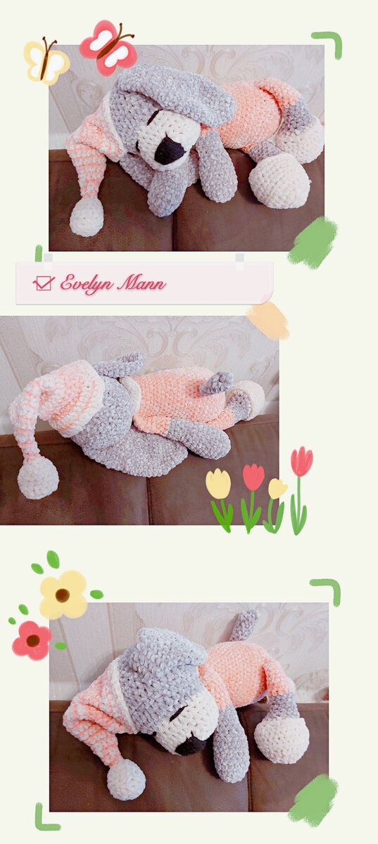 Условные обозначения КА - кольцо амигуруми ВП – воздушная петля СБН – столбик без накида ПРИБ – прибавка (провязать 2 сбн в одну петлю) УБ – убавка (провязать 2 сбн вместе за передние полу петли) ПССН - полустолбик с накидом ССН – столбик с накидом СС – соединительный столбик ( )* - повторить указанное число раз ГОЛОВА Белым цветом 1. 6 сбн в КА (6) 2. приб*6 (12) 3. (1 сбн, приб)*6 (18) 4. (2 сбн, приб)*6 (24) 5. (3 сбн, приб)*6 (30) 6-8. 30 сбн (3 ряда) 9. 12 сбн, приб*6, 12 сбн (36) Меняем нить (цвет собачки) 10. 36 сбн 11. 12 сбн, (1 сбн, приб)*6, 12 сбн (42) 12-20. 42 сбн (9 рядов) Наполняем по мере вязания.