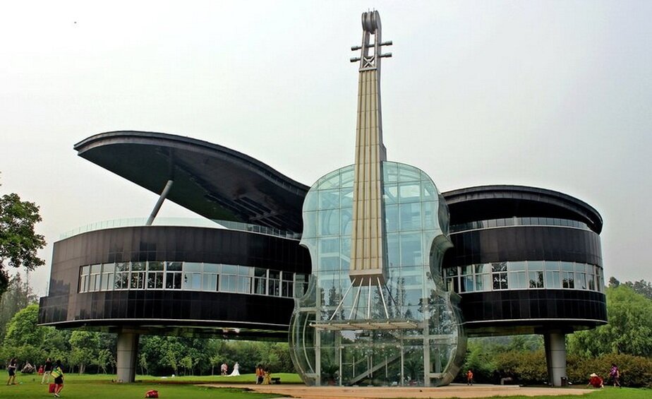 Дом-рояль со скрипкой Музыкальное здание, (Хуайнань, Китай)-Оно было разработано Хэбэйским университетом технологий и построено в 2007 году, чтобы привлечь внимание общества к недавно отстроенному району. Сооружение состоит из двух частей: "скрипка" (вход в здание, внутри находится эскалатор для подъема в "рояль") и "рояль"(собственно выставочный центр). Строение выполнено из прозрачного и черного стекла.Здание служит в качестве выставочного комплекса, в котором проводят культурные встречи, где представлены различные идеи и перспективы развития нового города.