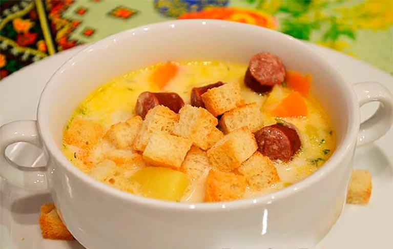 Очень сытный и вкусный сырный суп с плавленым сыром. Готовится просто и довольно быстро. Добавьте в суп немного копченых колбасок или сосисок, так будет вкуснее и ароматней. Продукты (на 6 порций): Сырок плавленый - 2 шт. (180-200 г.) Колбаски копченые - 150 г. Картофель - 3 шт. Лук репчатый - 2 шт. Чеснок - 3 зуб. Масло растительное - для жарки Зелень - по вкусу Соль - по вкусу Вода - 1,2 л. Сухарики (для подачи) Морковь - 1 шт. Как приготовить сырный суп с колбасками: Овощи очистить и нарезать. В казанке обжарить чеснок на растительном масле несколько секунд. Сразу добавить лук и морковь, жарить до прозрачности. Добавить колбаски, жарить пару минут. Добавить картофель. Жарить, помешивая, около 10 минут. Посолить по вкусу. Залить в казанок воду и варить суп с колбасками и овощами около 15 минут, до готовности картофеля. Натереть плавленый сырок на крупной терке. Добавить в суп плавленый сыр, мешать до полного растворения сыра. Выключить огонь и добавить в сы