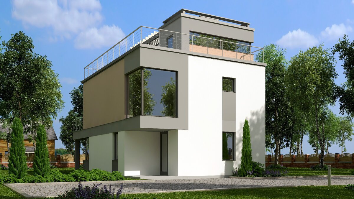 Компактный дом имеет внешне форму куба. Лишь благодаря цветовому обыгрышу получается разбить объем на взаимосвязанные блоки.