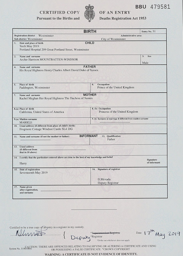 В сети появился интересный документ - копия свидетельства о рождении Арчи - сына Меган Маркл и принца Гарри. Согласно данному документу, настоящее и первое имя Меган - Рейчел. Таким образом, большую часть своей карьеры она пользовалась своим вторым именем, которое, видимо, казалось ей более звучным. Однако в официальных документах всегда указываются настоящие имена.