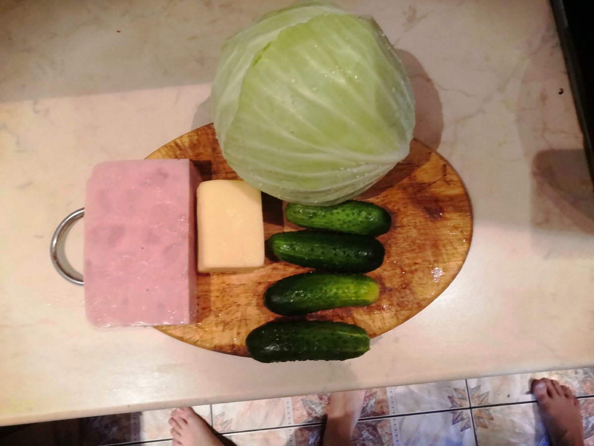 Нравится в этом салате сочетание сытного мясного продукта и легких полезных овощей. Очень легко и быстро сделать на овощерезке, но можно конечно использовать и терку. Итак, понадобится (примерно на 4 порции) : Ветчина - 350 грамм (лучше более постная) Сыр твердый - 200 грамм Капуста белокочанная - беру маленький кочан на 1 кг примерно, с учетом чистки от верхних листьев и удаления кочерыжки , он весь уходит Огурцы свежие - 300 грамм Майонез Все 4 продукта натираются на овощерезке или средней терке. С огурцов после терки надо обязательно слить воду. Перемешиваем в салатнике, добавляем по вкусу майонез. Приятного аппетита ! Понравилась статья ? Ставьте лайк и подписывайтесь на канал !