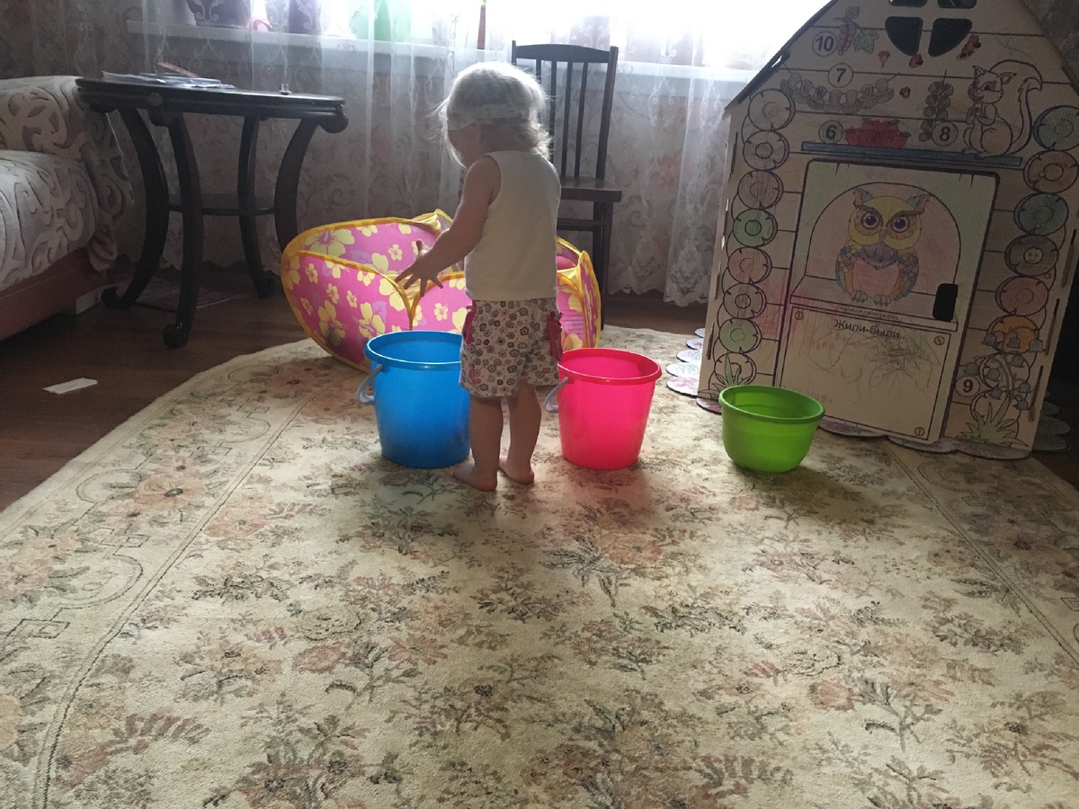 Подвижную мору для ребёнка можно организовать дома при помощи подручных материалов. Расскажу про интересную эстафету для детей в возрасте старше 1 года, когда ребёнок уже может уверенно ходить или даже бегать. Подвижная игра с мячами из сухого бассейна (или любыми другими мячиками: теннисные, резиновые, можно даже смять бумагу, если нет мячей нужного размера). В большую емкость кладём много мячиков/шариков, на расстоянии примерно трёх метров от ёмкости ставим одно или несколько вёдер. Задача ребёнка перенести мячи из одной ёмкости в другую. Вариантов подобной игры может быть много, также упражнение может решать дополнительные задачи. Например у нас дополнительная задача — это изучение цвета. Поэтому у нас три разных цвета мячей и три цвета вёдер: зелёные, красные и синие. Ребёнок берет мячик определённого цвет и челночным быстрым бегом складывает его в ведёрко нужного цвета. Если нет цветных вёдер, то можно использовать коробки, мешки, пакеты соответствующего цвета. Также можно об
