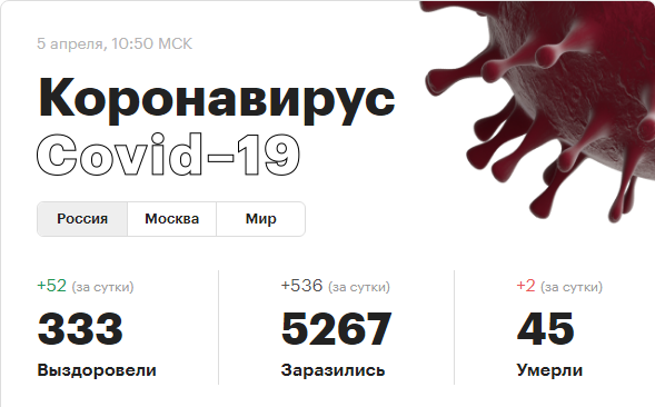 Число зараженных коронавирусом в России выросло до 4731 человек, 333 человека выздоровел, 43 умерли. Случаи заболевания зафиксированы в 78 регионах. Большинство субъектов страны ввело режим самоизоляции для всего населения. На улицу можно выйти для похода за продуктами и лекарствами, чтобы вынести мусор или выгулять собаку (не далее 100 м от дома).