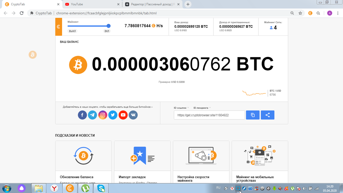 На сегодняшний момент у меня есть только браузер криптотаб который мне немножко приносит денег, немножко потому что слабый компьютер, если у вас нормальный компьютер то вам он будет нормально приносить. ВОт ссылка, заработал я на нем по сегодняшнему курсу 0,0208 долларов, умножаем на доллар сегодня 77 рублей, получается 1 рубль 60 копеек. 2. Дзен канал я только начал вести естественно на нем нет дохода Аудитория 69, и 17 дочиток.