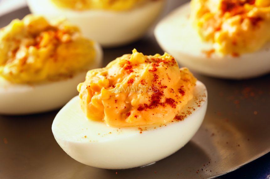 4.Наполнить половинки яичного белка и посыпать паприкой. Советы: Если у вас нет электрической мясорубки или она слишком большая, чтобы измельчить небольшое количество ингредиентов, то вы не сможете натереть начинку и просто очень мелко порезать помидоры, измельчить яичные желтки вилкой и все смешать с майонезом.