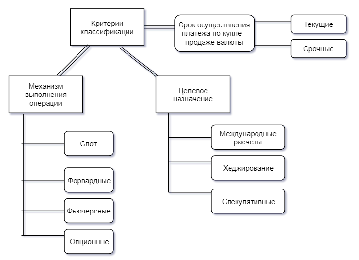 Наиболее типичными валютными операциями являются конверсионные операции, разнообразие которых, на сегодня, очень широко. На наш взгляд, эти операции наиболее удобно классифицировать по критериям, изображенными на рисунке ниже.