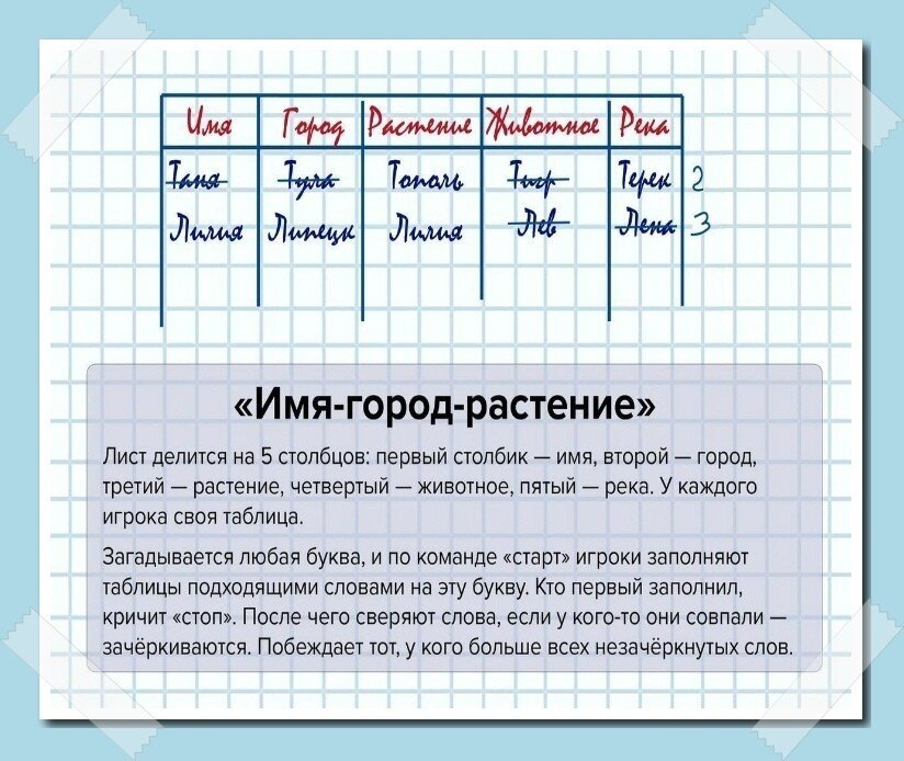 Имя-город-растение Игровое поле делится на 5 частей, где первая отвечает за имена, вторая за города, третья за растения, четвертая за животных и пятая за реки. По началу игры каждый участник вписывает максимальное количество слов, начинающихся с определенной буквы в соответствии с типом столбика. У кого получится больше уникальных слов – победитель.