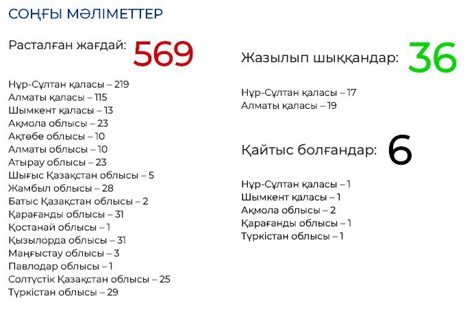 На сегодняшний день в Казахстане зарегестрировано 569 случаев заражения Коронавирусом.Карантин был назначен в нескольких городов Казахстана.Первый зараженный был найден в столице Казахстана Нур-Султане.Единственная хорошая новость это 36 вылеченных пациентов 19 в Алматы и 17 в Нур-Султане.Ожидается что пик пандемии в Казахстане как раз таки в апреле,так что мы настоятельно рекомендуем вас сидеть дома дожидаться конца этой пандемии. Напоминаем что количество умерших от Коронавируса в Казахстане достигло 6 человек Это не игрушка и не простая простуда или ОРВИ так что уважемые люди сидите в своих домах и только при полной необходимости выходите за продуктами.Если мы будем придерживаться этих правил мы победим этот вирус.