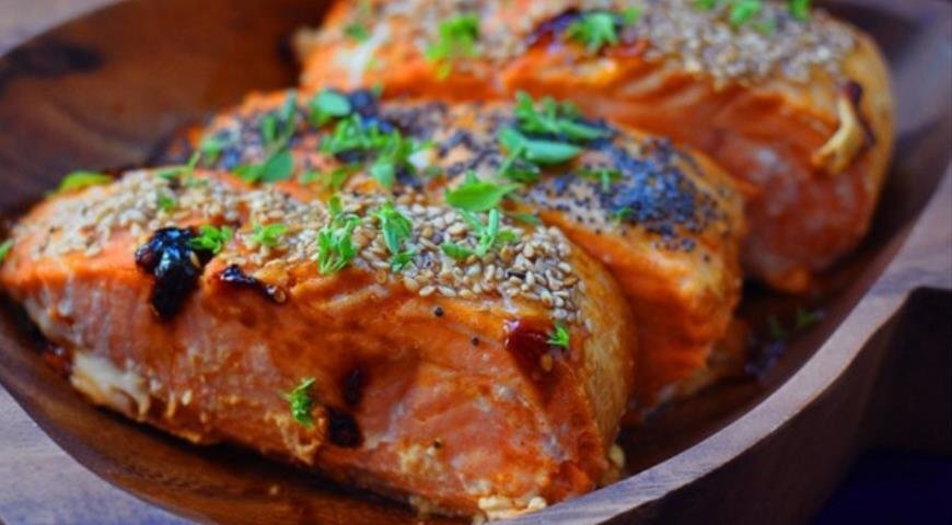 ИНГРЕДИЕНТЫ НА 4 ПОРЦИИ: 4 штуки - филе лосося(200 грамм каждый) 1 единица - лимон 2 столовые ложки - масло 1 столовая ложка - зерновой горчицы 1 столовая ложка - мёда 2 ломтика чеснока немного соли и немного перца ВРЕМЯ ПРИГОТОВЛЕНИЯ ПРИМЕРНО 20 МИНУТ СПОСОБ ПРИГОТОВЛЕНИЯ: 1.Смешайте масло, лимонный сок, мед, горчицу, рубленый чеснок и перец. Слегка натрите кусочки лосося этой смесью. Посыпать их солью по вкусу. 2.Положите на противень, выстланный пергаментной бумагой, и дайте постоять, пока духовка не нагреется. Разогреть духовку до 190 градусов С. 3.Выпекать около 12 - 15 минут, в зависимости от толщины кусочков. При подаче можно также посыпать рубленой зеленью, например, укроп или тимьян.