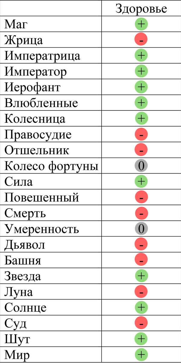 Быстрое гадание на здоровье. В нынешних условиях многие из нас беспокоятся о своём здравье и тех опасностях, что несёт нам пандемия. Предлагаю вам быстрый способ самостоятельно ответить на волнующие вопросы, без прохождения длительного обучения. 1) Итак, нам потребуются Старшие Арканы Таро. Если у вас полная колода, отделите Старшие Арканы, у вас должно получиться 22 карты. Если у вас вообще нет карт Таро, возьмите картон, нарежьте 22 прямоугольника и напишите на них названия карт из таблицы. 2) Далее формулируем вопрос таким образом, чтобы на него можно было ответить да или нет. Например: Заболею ли я? Есть ли опасность для меня в данной эпидемии (опасность будут показывать карты с минусами)? Хороший ли у меня иммунитет? Поможет ли мне данное лекарство? Если я буду лечиться самостоятельно, улучшение будет или ухудшение? Опасен ли для меня коронавирус (опасность будут показывать карты с минусами)? 3) Перетасовываем карты и вытаскиваем 5 карт, выкладываем в ряд. 4) Анализируем выпав