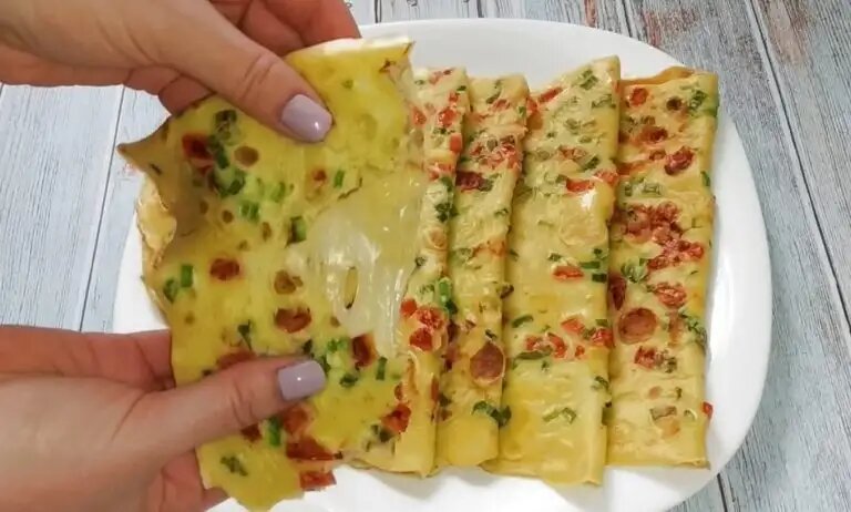 Буквально 15 минут и набор простейших продуктов – помидоры, яйца и сыр и все готово. Для приготовления вам потребуются такие ингредиенты: — яйца, 5 шт; — помидор, 2 шт; — сыр, 100 г; — соль, перец и прочие специи, зелень по вкусу; — мука и молоко по 1 ст.л; — зеленый лук. Процесс приготовления Взбиваем яйца с молоком и мукой. Можно миксером или венчиком. Помидоры режем мелким кубиком, лук и зелень рубим. Массы солим, перчим и вводим прочие специи по вкусу. Сковороду смазываем растительным маслом и выпекаем блины из массы. Обжариваем одну сторону, переворачиваем и на уже прожаренную сыпем тертый сыр. Сворачиваем блины вдвое и еще полминуты обжариваем. Совет: в такое тесто для блинов, вы также можете добавить мелко порезанный сладкий перец и чеснок – если готовите закуску к ужину.