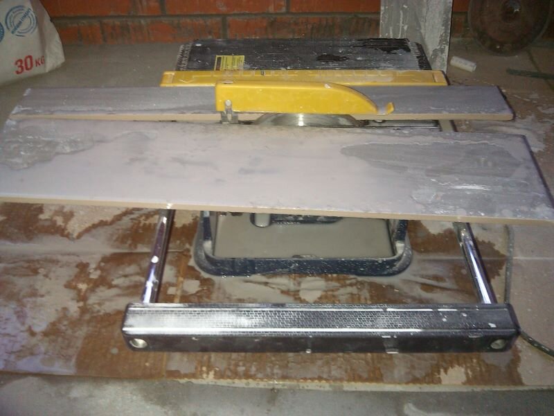 Валялся у меня электрический плиткорез. Ну как валялся... Лежал ждал следующего ремонта. После трудов праведных на двух моих квартирах. Простенький такой, цельнопластмассовый, ни грязи, ни ржавчины не боится. Асинхронник на 500 Вт, диск 180 мм с посадочным 15 или 22 мм. Керамгранит грыз хорошо, если не давить слишком. Даже фланец под пылесос есть, хотя зачем он, если с водой пилю? А тут приспичило мне на даче наличники с откосами напилить из вагонки. Посмотрел я на сей агрегат и думаю: "А чем не циркулярка?" Нашел в запасах пильный диск 180 мм с посадочным 22. Не, на болгарку я его не ставил ни разу. Я еще слишком молод, я жить хочу. Ну просто лежал и всё:) Поставил его в плиткорез, 26 мм вылет диска, если под 45 градусов пилить, то 18 мм. Для вагонки достаточно. Клин сделал из желтой изоленты по толщине пропила диска, а то там тоньше миллиметра железяка. И кусочек уголка этой железяки болгаркой спилил, а то она слишком близко к диску втыкается. С алмазным-то бог с ним, а тот с зуб