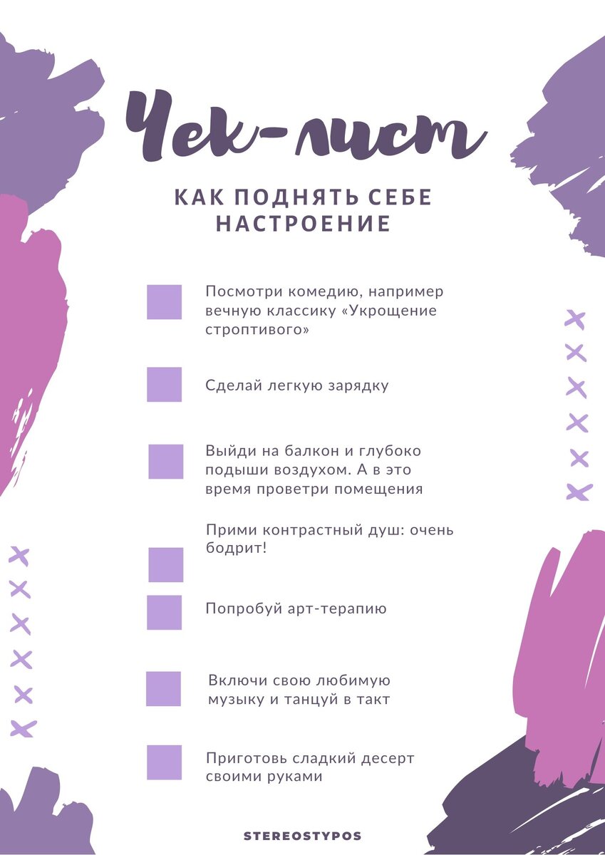 Всем привет! С вами STEREOSTYPOS. Дарим вам приятный сюрприз в виде чек-листа для времяпрепровождения в хорошем настроении в режиме домашней самоизоляции. Делитесь своими выполненными заданиями и успехами у нас в группе ВК, пишите свои впечатления и совсем скоро мы запустим интересный флешмоб, где наградим 2-х победителей и подарим приз. Скоро все расскажем! Следите за нашими аккаунтами в Яндекс.Дзене, Вконтакте и Телеграмм. А теперь, обещанный чек-лист Скачать чек-лист хорошего качества можно по ссылке: https://yadi.sk/d/Xzh-bmRBBhfv4A