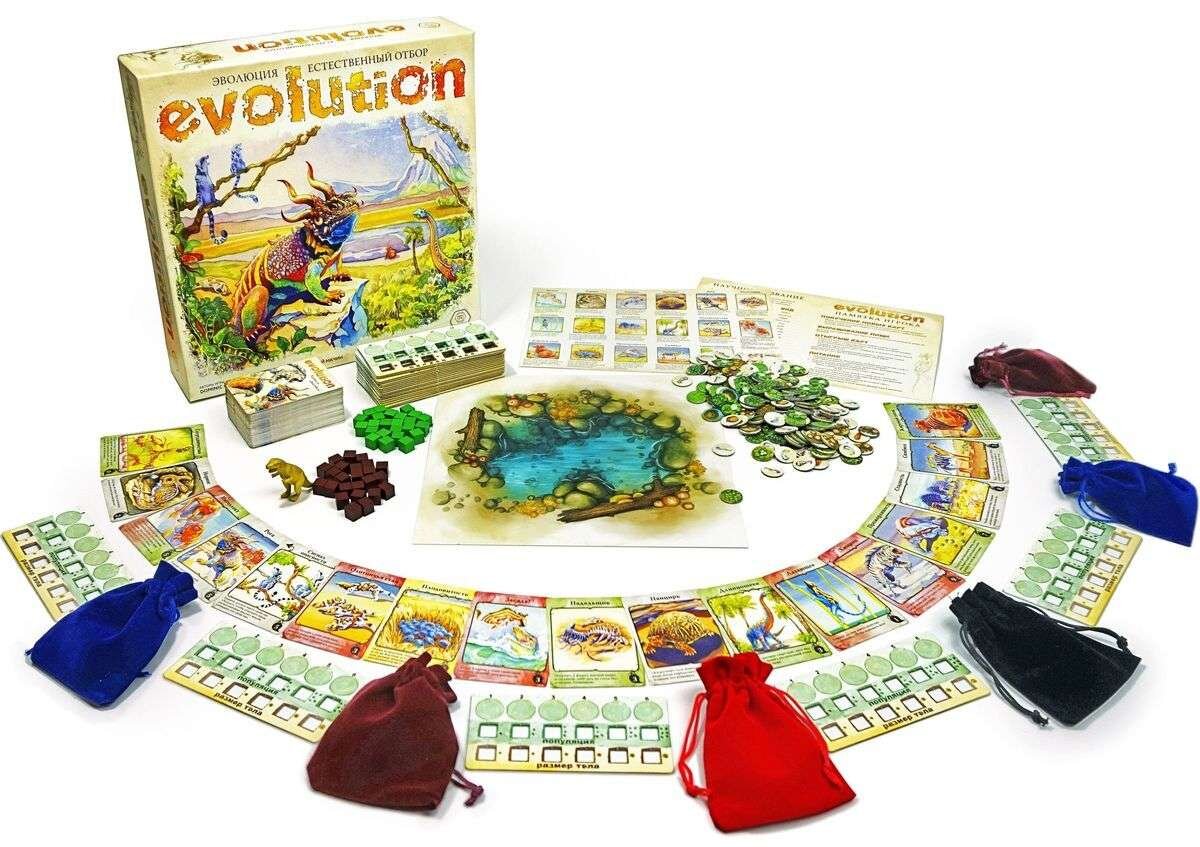 Так странно было слышать от друзей и знакомых, что они до сих пор не играли Эволюцию». А ведь игра достойна того, чтобы в нее поиграли хотя бы раз в жизни. Вся игра основана на теории Дарвина. В 2010 году она была создана кандидатом биологических наук Дмитрием Алексеевичем Кнорре. В 2011 году вышла также на английском, французском и немецком языках. Сама идея была настолько крутой и так сильно понравилась иностранным издателям, что уже в 2014 году ее переиздали, поправив механику и переделав оформление. Сначала нас коробка не сильно привлекла внимание. Однако описание побудило все же купить игру. Внутри коробки вас ждет поле Водопоя, 24 планшета животных, 180 двусторонних фишек еды, 48 деревянных маркеров, 129 карт свойств, 6 мешочков для еды, 1 фигурка Первого игрока. О чем игра Неспроста в самом начале статьи мы упомянули Дарвина. Игра прекрасно демонстрирует работу механизма естественного отбора. В самом начале партии никто из игроков не знает, каких существ они будут создавать,