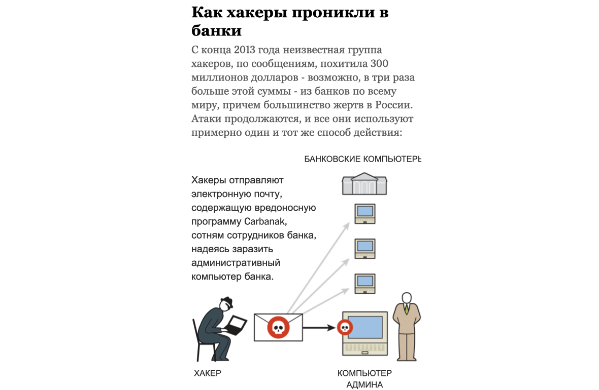 Во многих отношениях этот взлом начался стандартно. Киберпреступники отправляли своим жертвам зараженные письма — новость или сообщение, приходившие якобы от коллеги — в качестве приманки. Когда банковские сотрудники кликали, они ненамеренно скачивали зловредный код. Это позволяло хакерам распространяться по сети банка, пока они не добирались до сотрудников, управлявших системами перевода денег или удаленно контролировавших банкоматы.