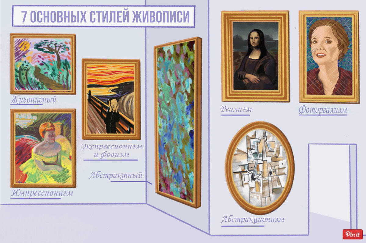 Этот список содержит семь основных стилей искусства (иногда называемых «школами» или «движениями»), некоторые из которых гораздо более реалистичны, чем другие.
