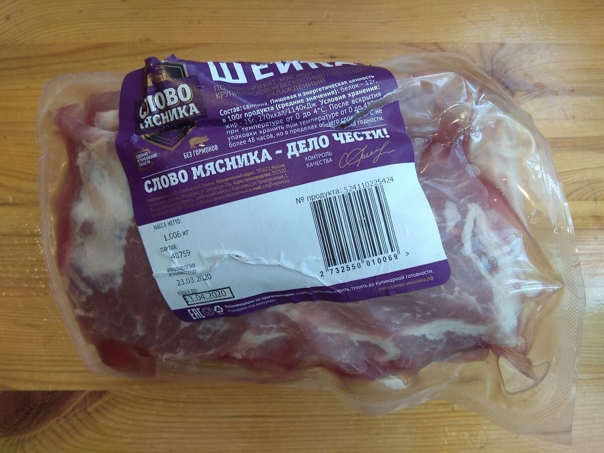 Свиная шейка "Слово мясника", куплено в Пятёрочке по цене в 300 руб. кг., что в принципе неплохо. Изготовлено ООО "Тамбовский бекон". Вес на упаковке указан как 1 кг. и 6 грамм. После того как мясо вынул из упаковки, слил сок и снял впитывающую подложку, вес уменьшился на 44 грамма, что мне кажется вполне допустимым, не критичным. Но, верхняя часть куска, та которая видна в пакете и не закрыта впитывающей подложкой, выглядит вот так. То есть, жирок немного с краю. А нижняя (скрытая) вот так. Жира чуть побольше и видно, что жирок и внутри. Впрочем, это же шейка. Она и должна быть в жировых прожилках. Вот так выглядит мясо на разрезе. Мне показалось немного жирноватым. Для запекания, что чаще всего со свиной шейкой и делают или на шашлык, вполне подойдёт. Я же тушил с картошкой. Боялся, что будет много жира. Нет, получилось в самый раз. мясо мягкое, жира натекло в меру. Так что - можно смело брать! Тем более, что в Пятёрочке из другого производителя мяса только Мираторг.