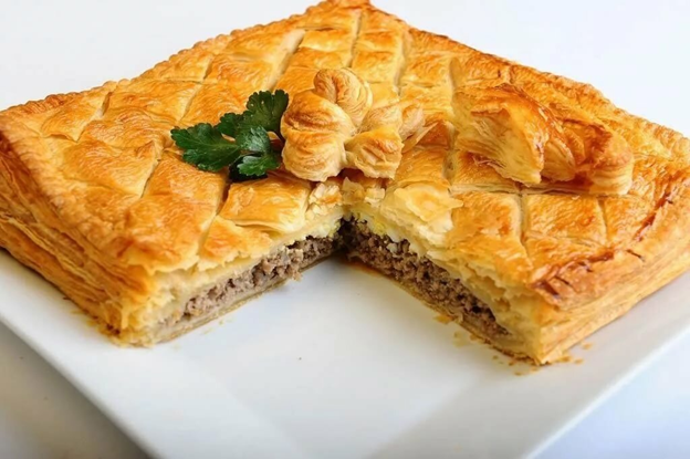 Пирог с мясом Нам понадобится: Слоёное бездрожжевое тесто – 800 грамм Мясной фарш-500 грамм Лук-2 шт. Картофель -3 шт. Соль -1 ч.л. Перец молотый-по вкусу Подсолнечное масло -2 ст. л. Приготовление: Берём любой фарш (я взяла свино – говяжий) и обжариваем его на сковородке 10 минут. На другой сковородке обжариваем мелко нарезанный лук до золотистой корочки. Режем картофель пластинками, солим. Смешиваем обжаренный фарш с обжаренным луком, добавляем специи по вкусу, солим, перчим. Тесто делим на две части. Раскатываем первую часть теста, выкладываем её на противень и раскладываем слоями фарш, смешанный с луком, потом картофель, нарезанный пластинками. Раскатываем вторую часть теста и накрываем ею пирог, подгибаем края пирога вовнутрь. В серединке пирога делаем небольшую дырочку и заливаем туда 1 ст. ложку мясного бульона или кипяченой воды. И на 30 минут на 180 градусов в духовку. За 10 минут до готовности, вынимаем пирог и смазываем яичным белком, пополам разведенным с водой, для крас