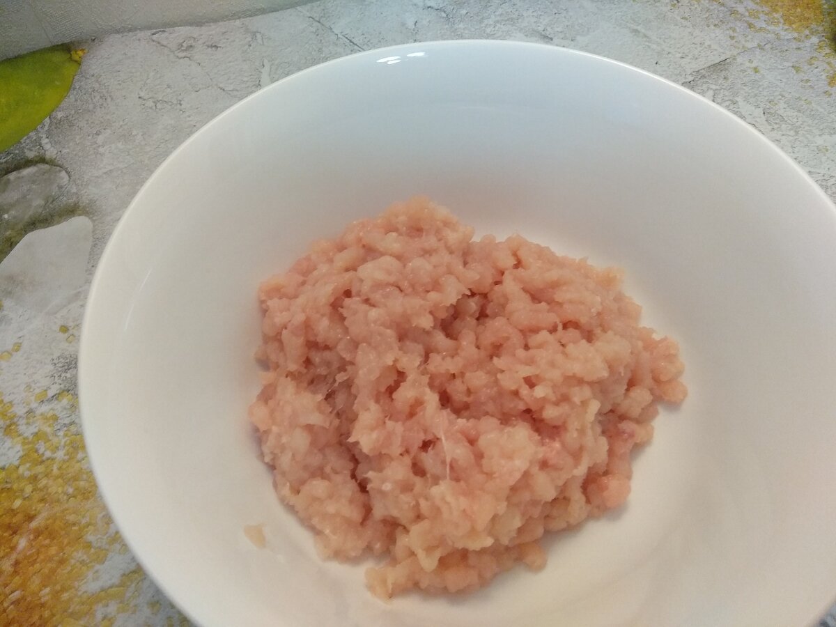 Филе куриной грудки хорошо вымыть и пропустить через мясорубку.