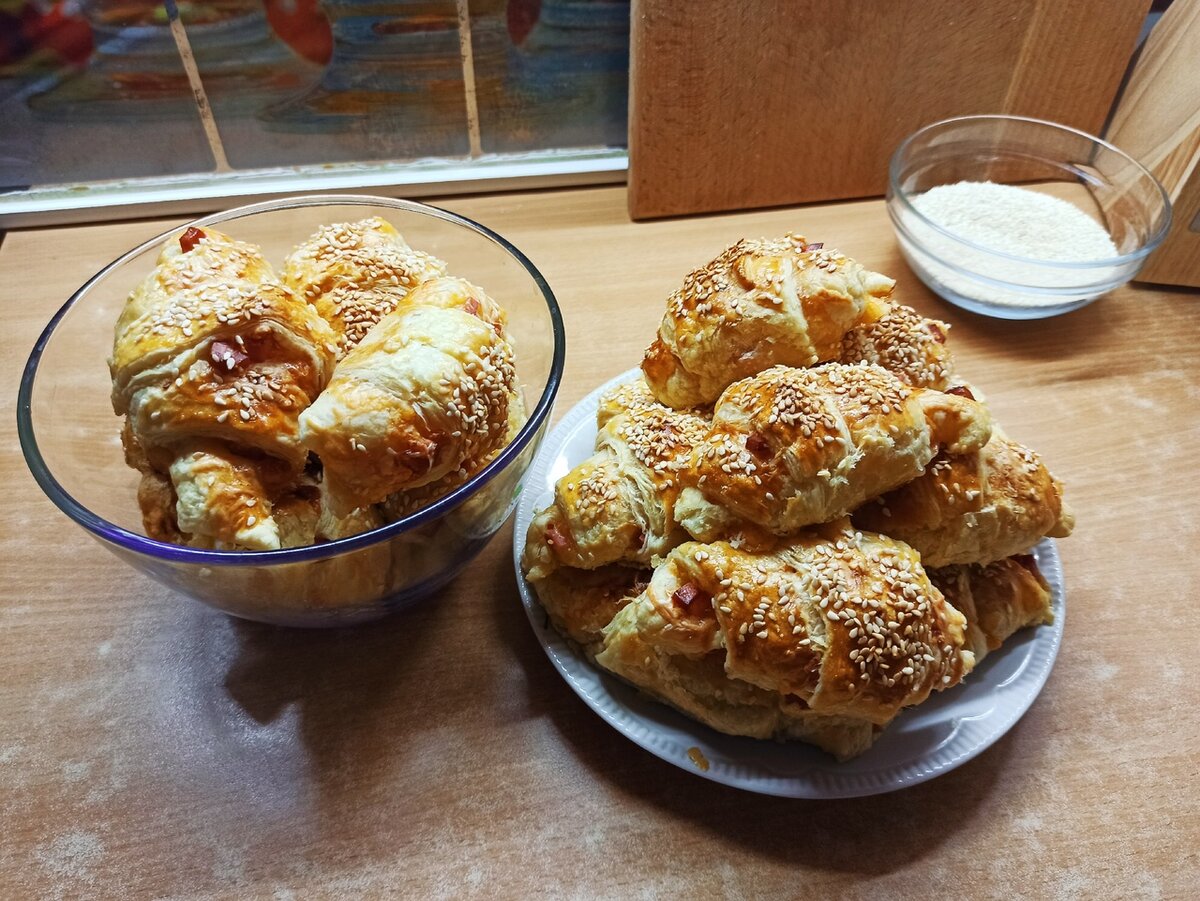 А этот рецепт самый лёгкий из лёгких!) Тесто брала покупное, слоёное бездрожжевое. Колбаса вареная, сыр Российский. На 1 кг теста у меня ушло пол палочки колбасы и сыра 200 г. Сыр натереть на мелкой тёрке, колбасу нарезать мелкими кубиком. Пласт теста я разрезала на 4 равных части, каждую часть раскатывала отдельно и резала на треугольники. Сначала выкладываем сыр, сверху колбаску и закручиваем в круассан. Выкладываем на противень, застеленный пергаментом. Отправляем наши круассанчики в солярий загорать при 180 г, на 25 минут) Приятного аппетита!