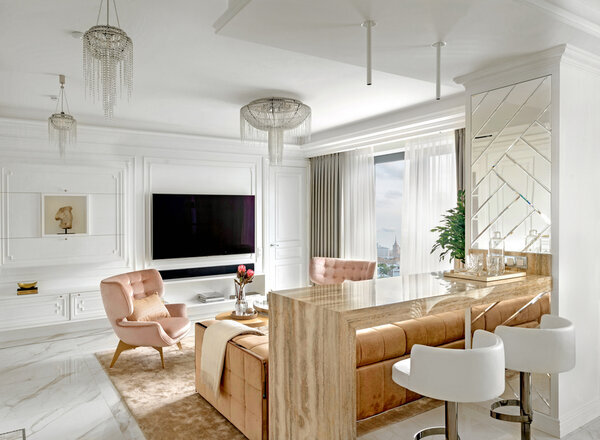 На оформление этой изысканной квартиры отводилось всего пять месяцев. Дизайнеры сделали ставку на материалы, высокие двери, буазери на всех стенах. А нейтральный белый цвет разбавили натуральным деревом, «вкусными» оттенками в текстиле и обивке мягкой мебели и позолоченными элементами.