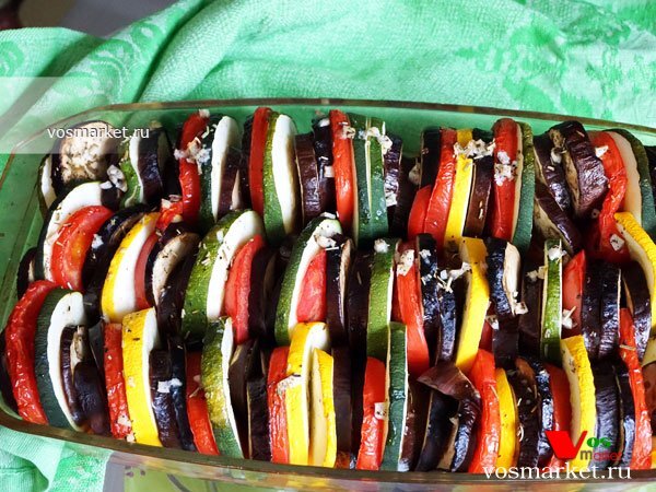 Рекомендации к рецепту "Овощной рататуй" Рататуй — вкусное, красивое и очень полезное овощное блюдо с необычным названием. Готовится оно в духовке, как правило, из овощей: кабачков, баклажанов, помидоров и болгарского перца, но иногда помимо традиционного для этого блюда набора овощей рататуй делается с картофелем, сыром и даже мясом, также к овощам добавляются различные специи и приправы по вкусу. Характерной особенностью этого блюда является необычная нарезка овощей и их красивая укладка в форму для запекания, это делает блюдо аппетитным и непохожим на другие овощные запеканки. По-настоящему летнее и яркое блюдо обязательно порадует своими вкусовыми качествами всю семью во время обеда или ужина. Сначала нужно приготовить овощную смесь, на которую в дальнейшем будут выкладываться кружочки овощей. Для этого луковицу и чеснок измельчить. Болгарский перец порезать на маленькие кубики. 2 помидора тоже мелко порезать. В разогретую с маслом сковороду поместить перец, лук и полов
