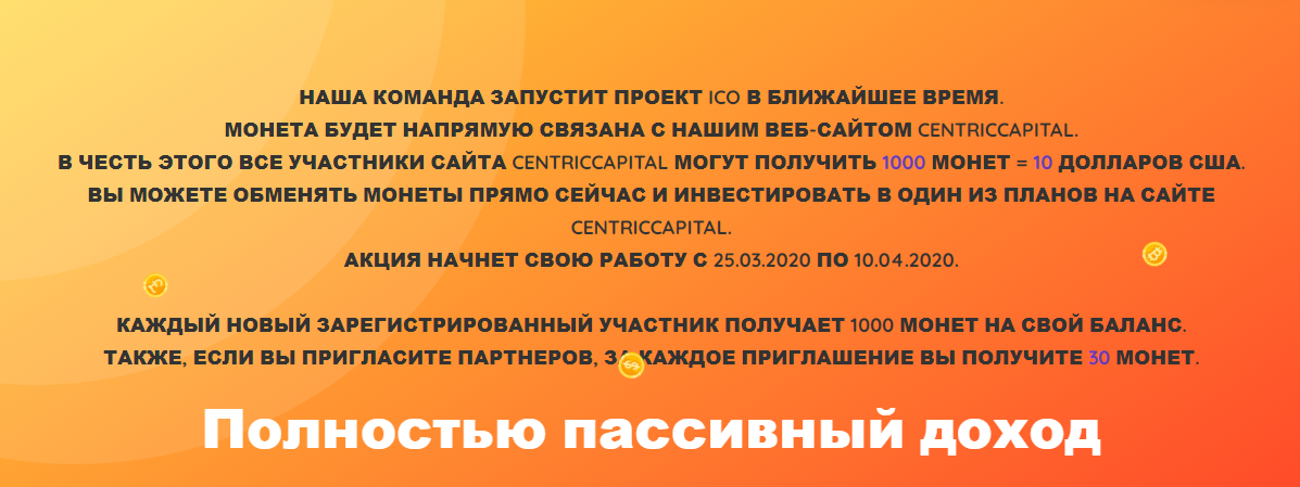 Всех приветствую ! Как вы поняли из скрина речь идет об очередной раздаче денег. Обратите внимание! Промо акция до 10 апреля, так что успевайте сам узнал только вчера. Итак обзор проекта... Компания Centric Capital LTD является официально зарегистрированным недавно, АО со всеми подтверждающими документами. Легенда гласит о том что зарабатывать мы будем на акциях лучших компаний мира. И даже то, что финансовая деятельность застрахована через Швейцарский банк. В общем так выглядит личный кабинет, как видите монеты я получил, поменял на доллары и положил на депозит. На все про всё вместе с регистрацией минутное дело. Инвестиционные планы не высокие ... Видно что проект собирается долго жить, потому что еще и страховка есть +5% от депозита. Самое главное начисления ежедневно и вывод на автомате, на Payeer минималка всего от 0.5$. Насчет реинвеста пока не разобрался. Есть вывод в BTC, ETH В общем будем проверять через несколько дней, пока тестируем. Регистрируйтесь изучайте, главно