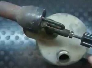 В первую очередь нужно будет разобрать паяльную лампу. Нам понадобится лишь верхняя её часть, без металлической ёмкости и насоса. Поэтому берём разводной ключ или прямо рукой, и выкручиваем из паяльной лампы верхнюю часть с соплом, предварительно сняв насос. Если лампа старая и уже успела заржаветь, то возможно потребуется воспользоваться какими-то растворителями ржавчины или ВД-40.