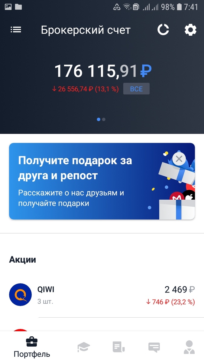 В марте я занялся оптимизацией своих расходов, о чём написал вам ранее. Это так же затронуло и мой публичный инвестиционный портфель. В нём я закрыл прибыльную позицию фонда FXMM и вывел со счета 50000 рублей. Брокер удержал 77 рублей подоходного налога при выводе средств, которые я сразу направил на закрытие кредитной карты Альфа банка. (Единственная кредитка с ежемесячным снятием без комиссии 50 тысяч рублей) Все поступающие денежные средства сегодня я перечисляю на накопительный счет в Россельхозбанке с начислением 5% годовых в конце месяца на ежедневный остаток денежных средств. Моя программа оптимизации на самоизоляции: Первостепенная задача на сегодня увеличить подушку безопасности, пополняя свой накопительный счет. В целом, мой публичный инвестиционный портфель сегодня показывает потери минус 13%. Я открыл его в Тинькофф банке, для того, чтобы проследить вместе с вами динамику изменений на фондовом рынке. Напоминаю, что при открытии брокерского счета сегодня, после его попол