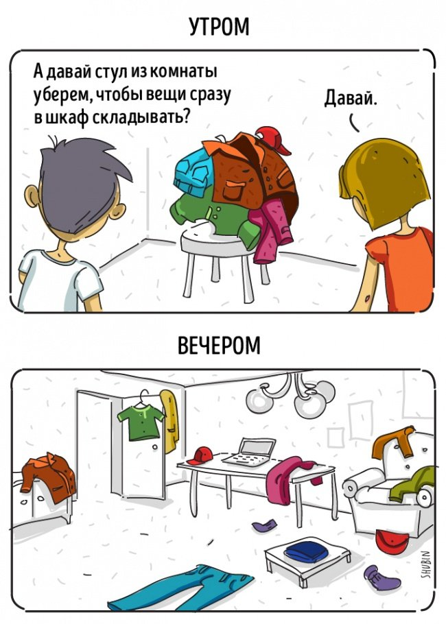 Каждый человек, который познал прелести совместной жизни с любимым человеком, ежедневно сталкивался с некоторыми забавными бытовыми ситуациями. Некоторые из таких случаев, мы рассмотрим в сегодняшней статье, благодаря талантливому художнику-иллюстратору, публикующему свои работы используя псевдоним SHUBIN. 1. Желание создать порядок В день, когда ваши глаза отказываются не замечать созданный вокруг беспорядок — вы решаетесь его навести. Но от своей природы не уйдешь... 2. Чаепитие Если вы уже познали все красоты семейной жизни, то наверняка сталкивались с подобной ситуацией, когда на вашу еду или напиток стремительно нацелен взгляд любимого человека. 3. Желание помочь Есть такие люди, которые никогда не просят о помощи, но если вы сами проявите инициативу, то очень скоро можете об это пожалеть. 4. Совместные игры Есть такое мнение, что чем больше нам недоступно то, что мы хотим — тем больше этого хочется. Если вы однажды это получите, то счастью не будет границ. А у вас есть какая-то