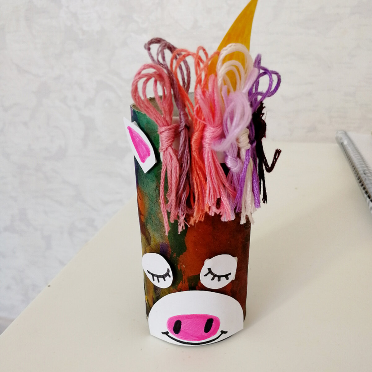 Творим вместе с ребёнком Для создания такого друга нам нужна втулка от туалетной бумаги, краски, бумага, нитки и клей. Мирон раскрасил втулку красками, их бумаги мы вырезали ушки, глаза и рот с рогом. Нитки сложили несколько раз и завязал узлом. Приклеили нитки на голову, отрезали "чёлку". Добавили глаза, рог, уши и ротик. По желанию можно добавить блёстки, бантики, пайетки - не ограничивайте себя😉 Интересно не только девчонкам, но и парням, как оказалось на моем примере☺️
