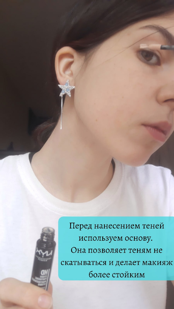 Но прежде всего мы должны нанести основу под макияж и убрать консилером венки и синячки на глазах. Помните, что даже сквозь темные и броские тени всё равно видно эти недостатки (Поскольку в интернете мало материала для визуала, решила сделать его сама. Не будьте слишком строги, я не волшебник, только учусь) Итак, шаг №1. Я пользуюсь основой от NYX. У них приятная кремовая текстура, которая не только хорошо впитывается, но и отлично держит макияж любой плотности. (Помните, что основа важна не только для эстетики. Основа макияжа не дает коже пересыхать и зачастую содержащиеся в ней компо
