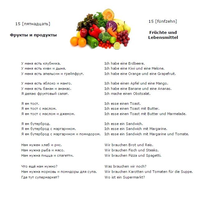 Немецкий язык. Урок 1. Немецкий язык. Урок 14. Добрый день! Продолжим изучение немецкого языка. Немецкий язык. Урок 15. 15 (пятнадцать) - 15 (fünfzehn) Фрукты и продукты - Früchte und Lebensmittel У меня есть клубника. - Ich habe eine Erdbeere. У меня есть киви и дыня. - Ich habe eine Kiwi und eine Melone. У меня есть апельсин и грейпфрут. - Ich habe eine Orange und eine Grapefruit. У меня есть яблоко и манго. - Ich habe einen Apfel und eine Mango. У меня есть банан и ананас. - Ich habe eine Banane und eine Ananas. Я делаю фруктовый салат. - Ich mache einen Obstsalat. Я ем тост. - Ich esse einen Toast. Я ем тост с маслом. - Ich esse einen Toast mit Butter. Я ем тост с маслом и джемом. - Ich esse einen Toast mit Butter und Marmelade. Я ем бутерброд. - Ich esse ein Sandwich. Я ем бутерброд с маргарином. - Ich esse ein Sandwich mit Margarine. Я ем бутерброд с маргарином и помидором. - Ich esse ein Sandwich mit Margarine und Tomate. Нам нужен хлеб и рис. - Wir brauchen Brot und Reis. Нам