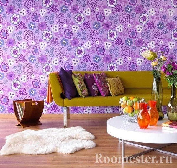 Дизайнеры, создавая новые модные интерьеры, не ограничивают применение какой-то стандартной поверхностью: использование не рекомендуется только для покрытия пола. Стены легко выполнить обоями, краской: матовой достигается глубина, глянцевой – воздушность, тонкость. Стеновые решения часто построены на контрастах разнообразных колеров оттенков фиолетового. Выполняется геометрическими узорами, комбинируя насыщенный темный внизу до самого светлого вверху, создавая необычный градиент.