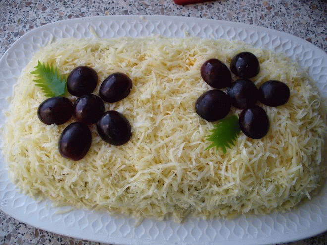 Продукты: яйца - 5 шт сыр -100 гр сёмга малосольная -200 гр сливочное масло - 100 гр майонез Приготовление: На блюдо продукты выкладываем слоями тертые яйца, тёртый сыр, кубиками порезанную сёмгу, тёртое сливочное масло. Каждый слой смазать майонезом. Салат можно украсить маслинами или красной икрой. Мне больше нравиться украшение из маслин, с икрой получается слишком насыщенный вкус рыбы. Приятного аппетита! А также, вам может быть интересны рецепты: Очень вкусный и простой салат "Африка" Салат с тунцом, овощами и зеленью Салат "Орхидея"