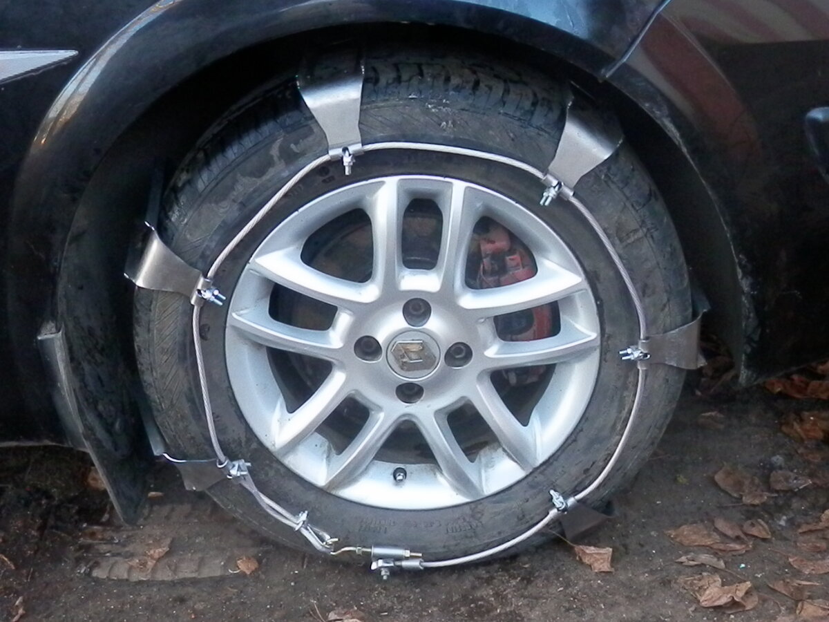 Ответ на комментарии Технический результат достигается тем, что «Устройство для повышения проходимости автомобиля», имеет грунтозацепы выполненные в виде загнутой скобы, на поверхности грунтозацепа соприкасающейся с полотном дороги выполнены ребра, выполняющие роль грунтозацепов. Боковые поверхности грунтозацепов имеют изгибы повторяющие изгибы боковых поверхностей шины колеса, на концах боковых поверхностей грунтозацепа выполнены петли с окнами для крепления тросов. Грунтозацепы расположены и закреплены по поверхности протектора шины колеса посредством тросов, пропущенных через петли грунтозацепов и зафиксированных в окнах петель зажимами троса, препятствующие смещению грунтозацепов относительно протектора шины, при вращении колеса. На боковых поверхностях грунтозацепов установлены механизмы крепления и натяжения тросов. На свободные концы тросов (с обоих сторон) устанавливаются коуши и закрепляются зажимами троса. Далее коуши надеваются на крюки. Вращением гаек крюков происхо