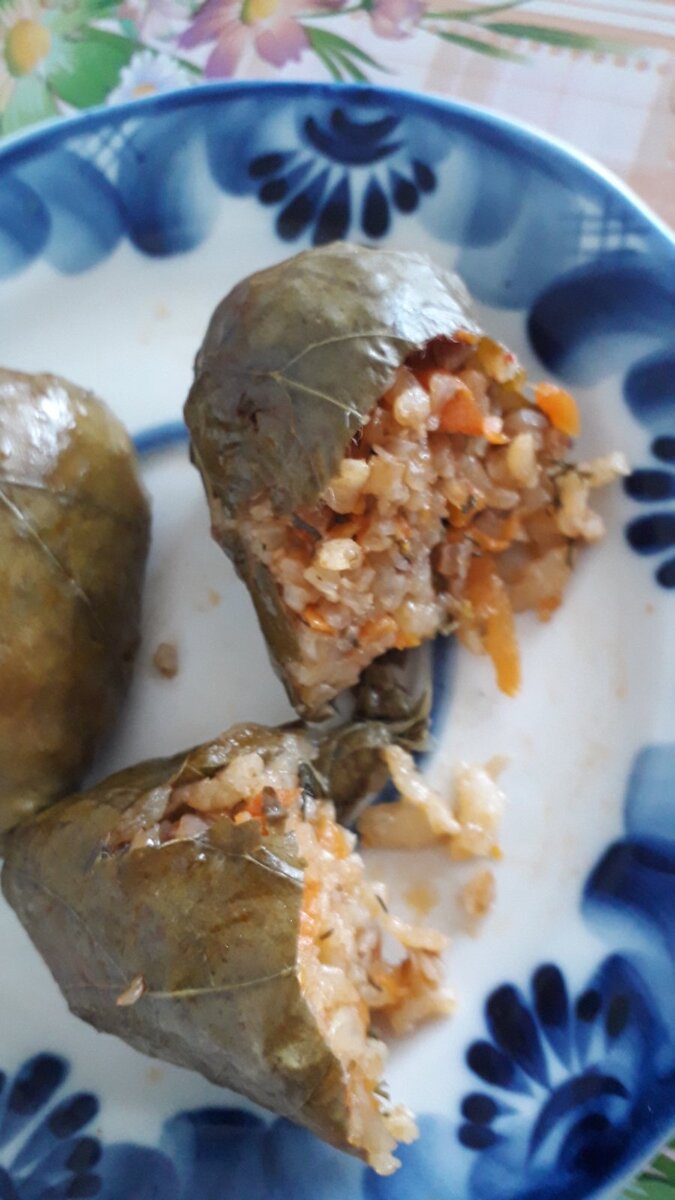 Завтра Благовещение Пресвятой Богородицы. Что бы приготовить необычное? Долма постная. Состав: На большую семью берем : 400 гр риса,150 гр гречки, морковь 3 - 4 шт, лук 0,5 - 1 кг (кто любит лук - побольше), зелень, (у нас укроп) 1-2 пучка, капуста 100 - 200 гр (чем больше, тем мягче получится), масло подсолнечное для обжарки (примерно 5 ложек), томат 1- 2 ложки, перец молотый, соль. Листья винограда соленые или свежие. Приготовление: Чтобы сделать расчет, сколько вам нужно фарша, на один лист нужно 1 ложку риса. Нарезаем лук, шинкуем капусту, морковь трем на терке. Обжариваем все отдельно. Рис и гречку промываем и парим. Когда все остынет, смешиваем (рис, гречка, обжаренные лук, морковь, капуста, томат и рубленную зелень. Все хорошо перемешиваем, солим, перчим. Листья промываем, если они соленые, а если свежие - ошпариваем. Заворачиваем фарш в листья и укладываем в чугунок. На дно чугунка предварительно укладываем листья капусты, пару штук шариков перца душистого, лавр, и 1 ложку мас