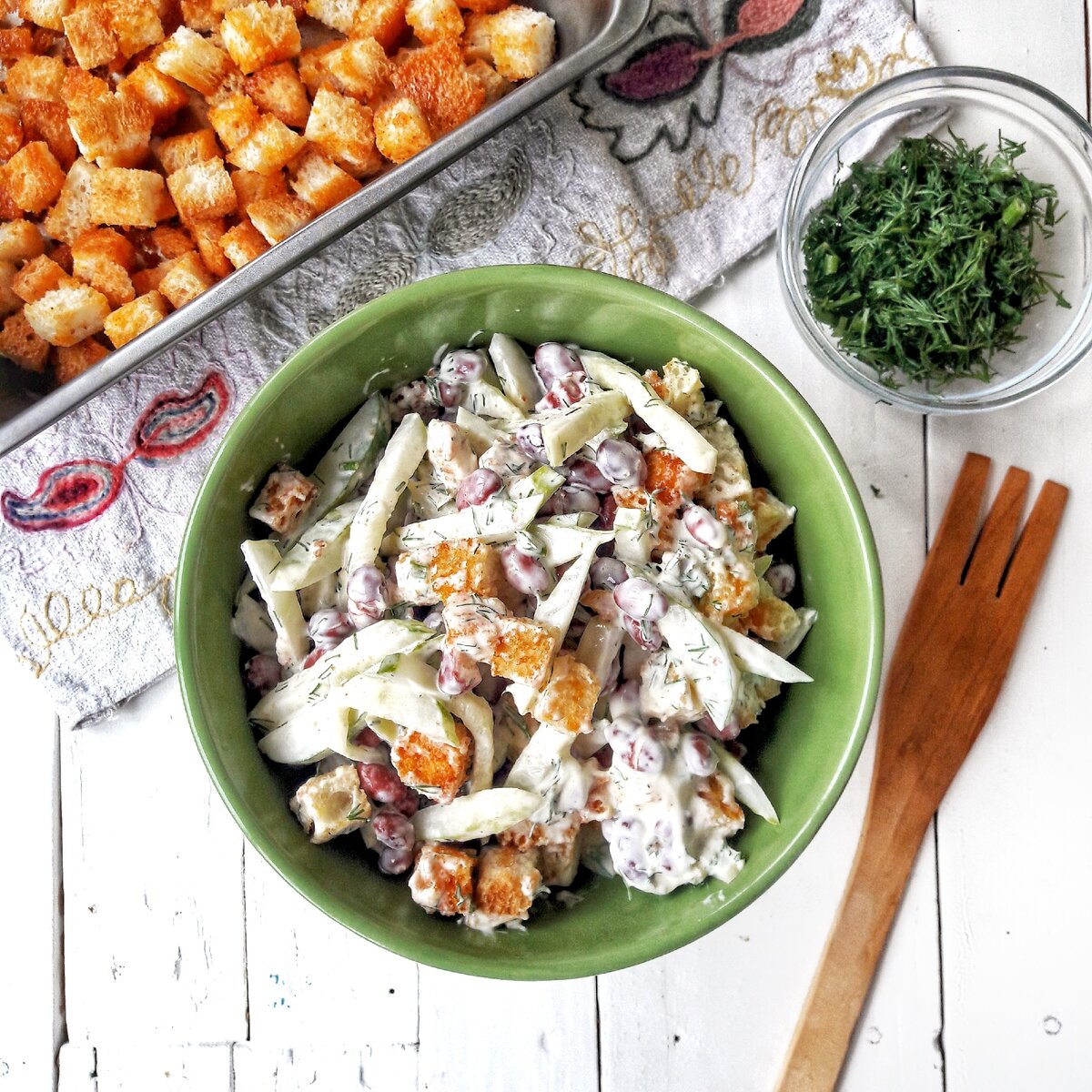 Салат ну очень прост в приготовлении, но получается сытным и вкусным. Его можно приготовить не только на обед-ужин, но и быстренько сделать и подать если гости стоят уже у порога. Данный рецепт подойдет и для вегетарианцев, если в качестве соуса для заправки взять вегетарианский майонез. Кстати, веганский майонез можно сделать самому из семян льна. Ингредиенты: Как приготовить: Сухарики можно использовать готовые покупные, но я предпочитаю самодельные чесночные. Делаются очень просто! Батон нарезать небольшими кубиками, подсушить в духовке. Главное их там не забыть! Иначе получатся угольки, что было у меня ни раз. Пока сухарики подсушиваются и подрумяниваются, приготовить соус. Пару ложек растительного масла, раздавленные 2-3 дольки чеснока, щепотка соли и 1/2 ч.л. сладкой паприки. Перемешать. Пока сухарики горячие, полить соусом и перемешать. Дать остыть. Получаются ароматные чесночные сухарики! Приятного аппетита!