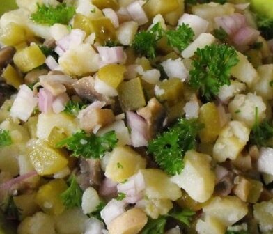 Всегда любила рецепты простые и сытные. Это - один из них. Готовили мы такой салат еще в студенческие годы. "Улетал" одним из первых, сколько бы блюд ни было на столе. Итак. Ингредиенты : картофель отварной - варить надо в мундире, это - обязательное условие. Так получается гораздо вкуснее, нежели использовать картофель, который перед варкой очистили. Маринованные огурчики. Именно маринованные. Колбаса "Докторская", или любая другая похожая. Зелень - по желанию и предпочтениям едоков. Лук - если любите. Для заправки - сметана с майонезом. Можете просто сметаной заправить. На свой вкус ориентируйтесь. Вместо колбасы можно использовать консервированные шампиньоны. Очень хорошим дополнением будет черный молотый перчик. И хлебушек "бородинский"...Приятного аппетита.