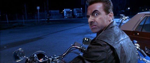 Однажды герой молодежной комедии "Американский пирог" Чак Шерман сказал в одной из частей, что считает фильм "Терминатор 2" лучшим в истории мирового кинематографа. Дело вкуса, конечно, но картина до сих пор обсуждаемая и в своем жанре по-любому одна из лучших. Интернет в настоящее время наводнен мемами и веселыми приколами на тему "Терминатора". Однако это я сегодня увидел впервые, потому и спешу поделиться, лично меня улыбнуло. Никогда мне не нравился британский комик Роуэн Аткинсон, однако как его примерили на костюме Терминатора - это и впрямь забавно вышло. Первое фото, которое я увидел и мне оно показалось наиболее веселым. Думаю, если бы он с таким выражением лица забирал у байкера одежду, тот бы явно сопротивлялся активнее. Ибо проиграть такому юмористу ну было бы просто обидно. Сложно представить насколько была бы забавной первая сцена, в которой терминатор приходит из будущего. И вот с таким выражением лица. Следующий опус - противостояние двух терминаторов - Аткинсон снова