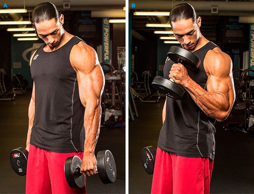 Продолжаю публиковать для вас статьи с разбором самых эффективных по моему мнению упражнений для всех мышечных групп. И сегодня мы поговорим о таком упражнении как «молот». Это упражнение направленно на развитие бицепса и поможет сделать ваши руки более объёмными с выделяющимся «пиком». Основной особенностью данного упражнения является положение кисти и здесь они развернуты боков что отличается от большинства других упражнений когда мы говорим о прокачке бицепса. С помощью такого положения рук мы имеем возможность выполнять работу с большим весом ведь таким образом нам проще удерживать гантель, так же помимо бицепса в данном упражнении активно задействуется такая мышца как брохиализ. Она располагается под бицепсом и при активных тренировках как бы выталкивает двуглавую мышцу наружу делая бицепс визуально более округлым. Техника выполнения Для выполнения данного упражнения займите положение стоя или сидя. Ноги сведены, руки опущены вниз по бокам, в руках удерживаем гантели. Поочер