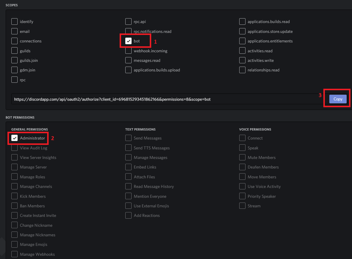 Приветствую всех, кто также как и я хочет попробовать написать бота для сервера в Discord'е! Я покажу как писать несколько базовых команд, таких как: бан, кик, разбан (ну или как там это на русском), очистка чата и мы заменим стандартный встроенный help на свой (также это будет практика работы с embed'ами). Весь код, который будет в этой статье - в конце. Начнём с установки python. Делается это на официальном сайте. Качаем последнюю версию. После установки python'а скачаем и установим редактор кода. Их существует огромное множество, но я использую Visual Studio Code. Создадим самого бота. Для этого переходим по ссылке и регистрируем бота: нажимаем кнопку New Application, даём боту имя и нажимаем Create. В левом столбце видим вкладку Bot - переходим к ней. Нажимаем кнопку Add Bot => Yes, do it! В том же левом столбце переходим во вкладку Oauth2, выставляем настройки, копируем ссылку и переходим по ней: После перехода по ссылке видим окно с выбором сервера. Добавляем бота на сервер, где