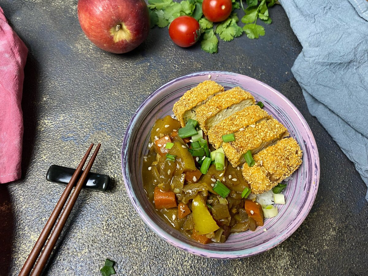 Панированный хрустящий жареный тофу, ароматный карри соус с овощами и яблоками, вместе создают интересный ансамбль вкусов, который особенно придётся по вкусу тем, кто любит экспериментировать и открыт новым вкусам. Кстати, еще иногда тофу именуют как соевый сыр или соевый творог. Ингредиенты: Для кацу-тофу: Для карри-соуса: Для подачи: Приготовление: 1. Нарезаем тофу довольно толстыми кусочками, примерно 1-1,2 см толщиной. Выкладываем в контейнер и маринуем в специях и соевом соусе. Хорошенько встряхиваем. Оставляем мариноваться в холодильнике минут 15-30. 2. Пока тофу маринуется, приготовим карри-соус. Для этого нарезаем все овощи кубиком. Яблоко и морковь крупно, лук средне, чеснок и имбирь -- мелко (можно натереть на тёрке). 3. В сковороду с разогретым маслом добавляем лук, чеснок и имбирь. Обжариваем до мягкости, затем добавляем специи. Обжариваем до появления аромата и добавляем остальные о
