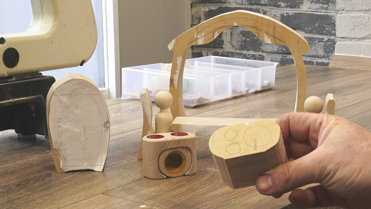 Вторая часть рассказа, как сделать своими руками замечательный набор мини мебели, заключенный в рамку в форме домика. Чертеж для самостоятельного изготовления игрушки по ссылке в шапке канала. Расскажу подробнее про мойку и холодильник с распашной дверцей. Дно из фанеры с прорезным окном и бортиком в форме домика, добавляет уюта и служит коробкой для хранения одновременно. Посмотрите Видео обзор готового конструктора Начну с рассказа про изготовление детали кухонной мойки. Она уже грубо выпилена при раскрое, теперь добавляем детализацию. Шлифую вырезанные детали, выравнивая все грани убирая следы от пильного полотна. Высверливаю отверстие, символизирующее раковину сверлом форстнера 25 мм и из двух шкантов диаметром 10 и 6 мм делаю кран. На настольном лобзике выпиливаю нижний шкафчик и выбираю в нем внутреннее пространство. На боковине делаю запил под ручку и окрашиваю Кухонная мойка для кукольного домика готова. Приступаю к самой интересной детали проекта- ХОЛОДИЛЬНИК! Размеча