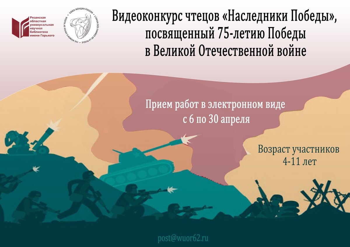 В целях приобщения детей к культурно-историческому наследию и формирования чувства гордости и любви к своей Родине Рязанская областная библиотека имени Горького и областной Совет женщин объявляет видеоконкурс чтецов «Наследники Победы», посвященный 75-летию Победы в Великой Отечественной войне. В конкурсе могут принять участие дети в возрасте 4-12 лет.