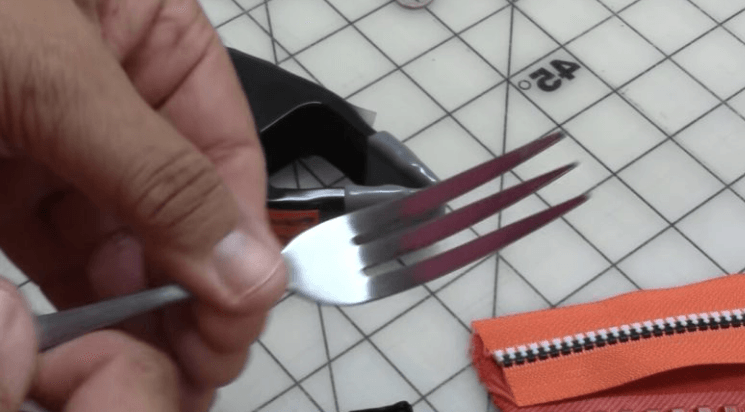 Чтобы вернуть бегунок на молнии на место, частенько приходится потратить много времени и сил. Достаточно сложно одновременно держать и молнию, и замок, и пытаться соединить их в одно целое. Но есть одна хитрость, с помощью которой это можно сделать за несколько секунд. Всё, что понадобиться — это вилка с тремя зубцами. Если у вас в доме таковой нет, то у вилки с четырьмя зубцами, можно соединить два зубца в один при помощи плоскогубцев. Сперва необходимо подготовить замок и молнию. Затем надеть замок на вилку с тремя зубцами. Потом легко можно будет продеть молнию в замок. Это не только несложно, но и очень быстро. Уже через несколько секунд молния будет работать как всегда.