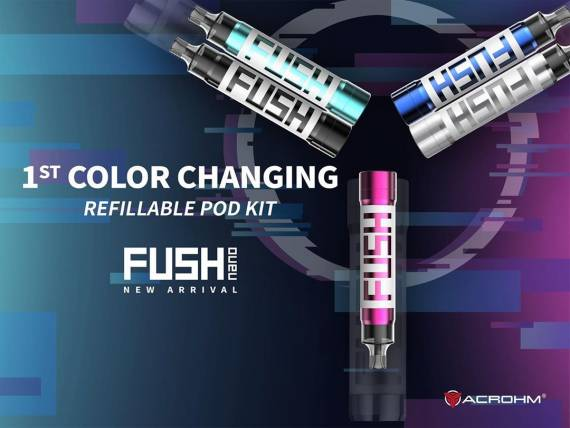 Acrohm FUSH nano Pod kit Размеры: 102 х 19.3мм Вес: неизвестен Материал корпуса: металл + пластик Питание: встроенный 550мАч Емкость картриджа: 1.5мл Сопротивление испарителя: 1.4Ω Выходная мощность: до 10Вт Режим работы: POWER Защита: от низкого / высокого сопротивления, от перегрева, от короткого замыкания, от перезаряда / переразряда Тип коннектора: магнитный Экран/диагональ: нет Micro-USB порт/зарядка: есть, ток зарядки 1А Цвет: смотрите фото ниже Комплектация — FUSH nano mod — сменный картридж 2шт (один предустановлен) — темляк — USB кабель — руководство пользователя — гарантийный талон Внешний вид нашего гостя весьма узнаваем – тут вам и форм-фактор поможет, да и кричащее лого на боковине. Как вы уже знаете, под умеет изменять подсветку, притом светится он почти полностью – достаточно просто его тряхнуть, как следует. Габариты довольно крупные – на стелс рассчитывать навряд ли стоит. Разработчики со старта предлагают пять вариантов исполнения – неплохо, выбор у поклонников б