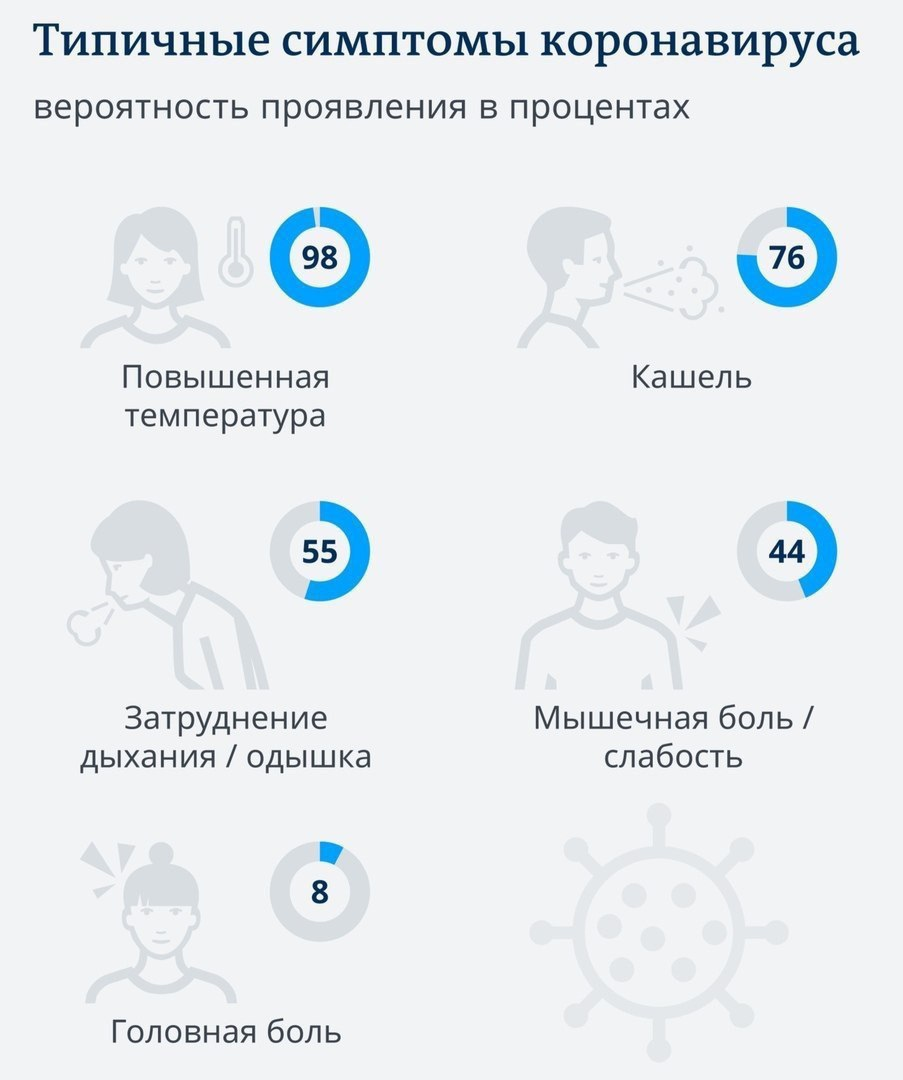 Врачи назвали основные признаки коронавируса у человека: — слабость, усталость — затрудненное дыхание — высокая температура — кашель (сухой или с небольшим количеством мокроты) и/или боль в горле По симптоматике коронавирус схож с простудой и респираторными заболеваниями. Особое внимание стоит обратить на одышку: при ее наличии немедленно обратитесь к врачу. Чтобы не заболеть и избежать инфицирования, специалисты рекомендуют: У троих священнослужителей Русской православной церкви в Москве выявили коронавирус, еще у двоих его подозревают, сообщает Рабочая группа при патриархе по координации деятельности церковных учреждений в условиях коронавируса. Коронавирус официальная статистика на 6 апреля: В России: Умерло — 47 Выздоровело — 406 Случаев заражения — 6,343 Проведено тестов — 758,401 В Украине: Умерло — 38 Выздоровело — 28 Случаев заражения — 1,319 В мире: Умерло — 73,872 Выздоровело — 277,707 Случаев заражения — 1,330,492 Основные очаги заражения: США (356,653 / 10,516) Ис