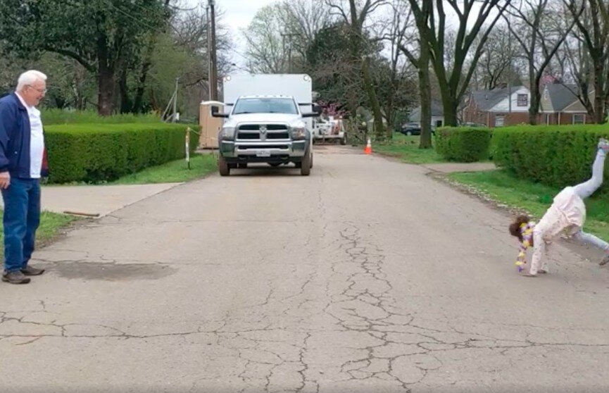 Шерри Нили из американского города Нэшвилл вместе с 6-летней дочерью Кирой живет на противоположной стороне улицы от своих пожилых родителей. Чтобы не подвергать их опасности во время эпидемии коронавируса, родственники придумали необычное развлечение – танцевать, находясь по разные стороны дороги, пишет Today.Parents. Кира и ее 81-летний дедушка Марвин устраивают танцевальные состязания, соблюдая при этом правила карантина. Танцоры становятся друг напротив друга по разным сторонам улицы, а затем по очереди танцуют под любимые песни девочки. Недавно мама Киры выложила в Facebook веселый и трогательный ролик, на котором дедушка и внучка исполняют танец под композицию «ABC» Jackson Five. Видео вызвало интерес и отклик у интернет-пользователей. Помимо этого, Кира и Марвин играют в футбол через дорогу. Еще девочка рисует для дедушки и бабушки большие рисунки на асфальте, чтобы они увидели их издалека. По словам Шерри Нили, ее отец Марвин иногда садится на стул на своей стороне улиц